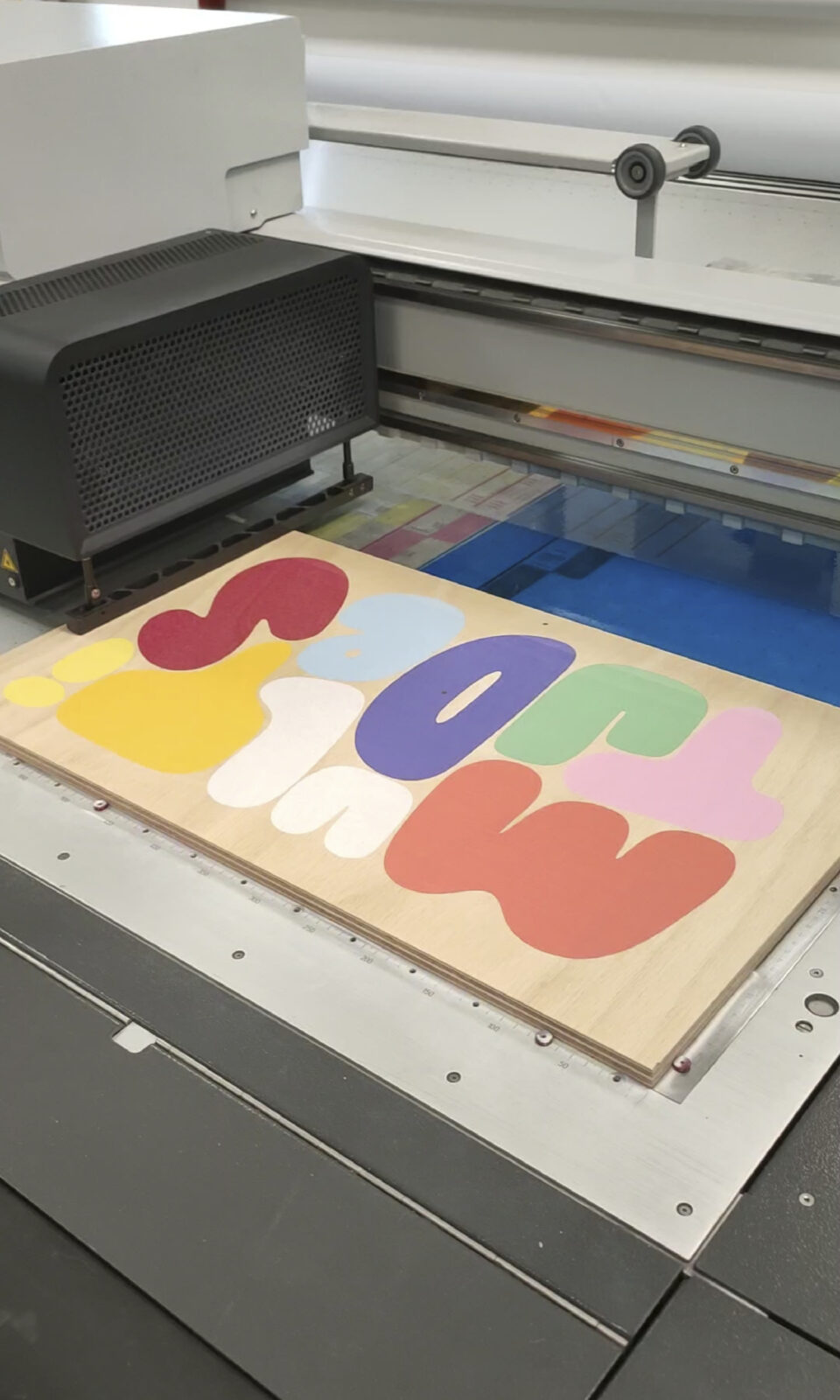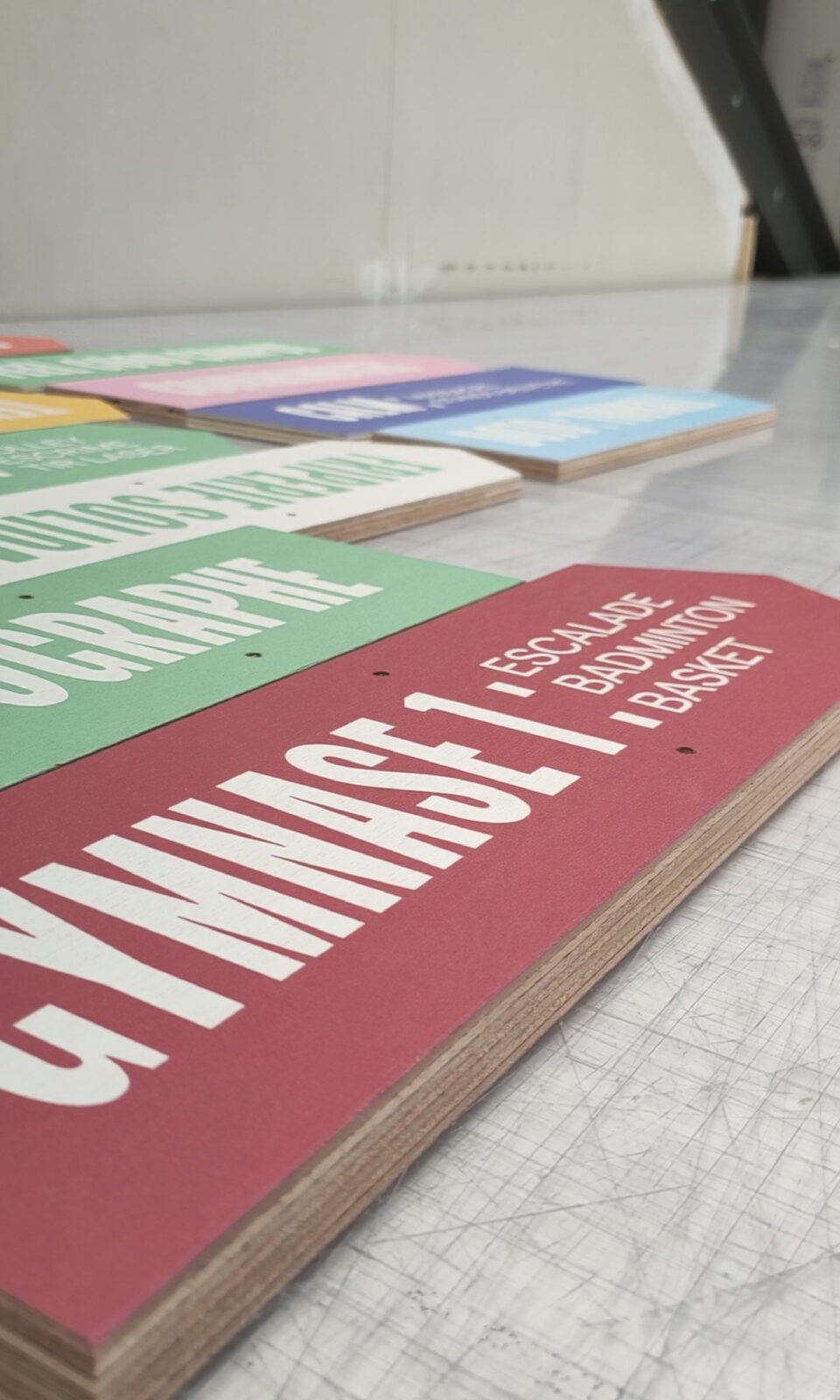 Une fois le design validé, le bois contreplaqué prend vie. Les formes sont découpées avec précision pour obtenir des flèches nettes et parfaitement calibrées. Le futur totem commence à se matérialiser.